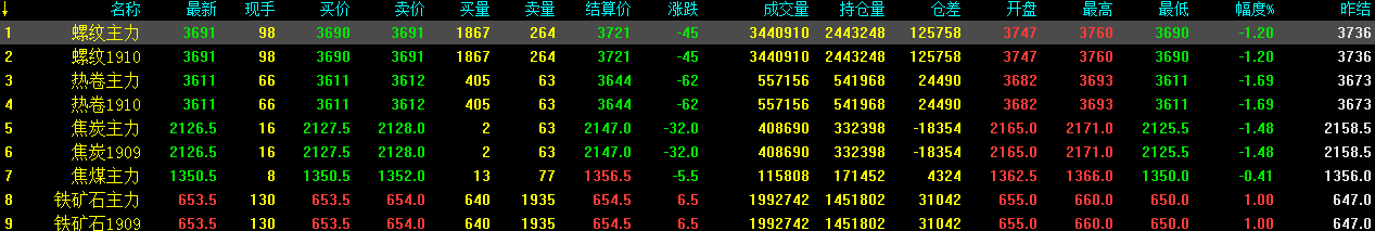 13日螺紋1910收3691跌45,供強(qiáng)需弱的趨勢(shì)明顯,預(yù)計(jì)期螺續(xù)跌;熱卷1910收3611跌62,鐵礦石收653.5漲6.5