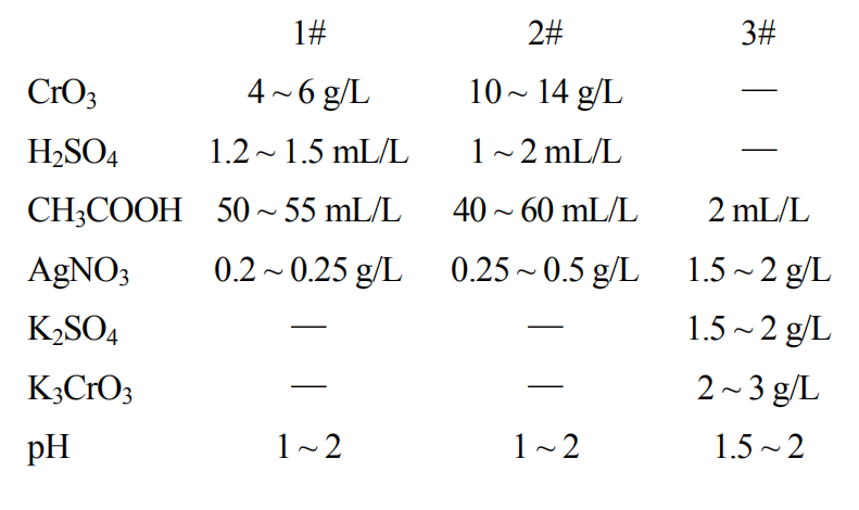 排除方法:稀釋鈍化液至pH達1~2時,再按照稀釋時用去的水量來補充CrO3、AgNO3及CH3COOH。